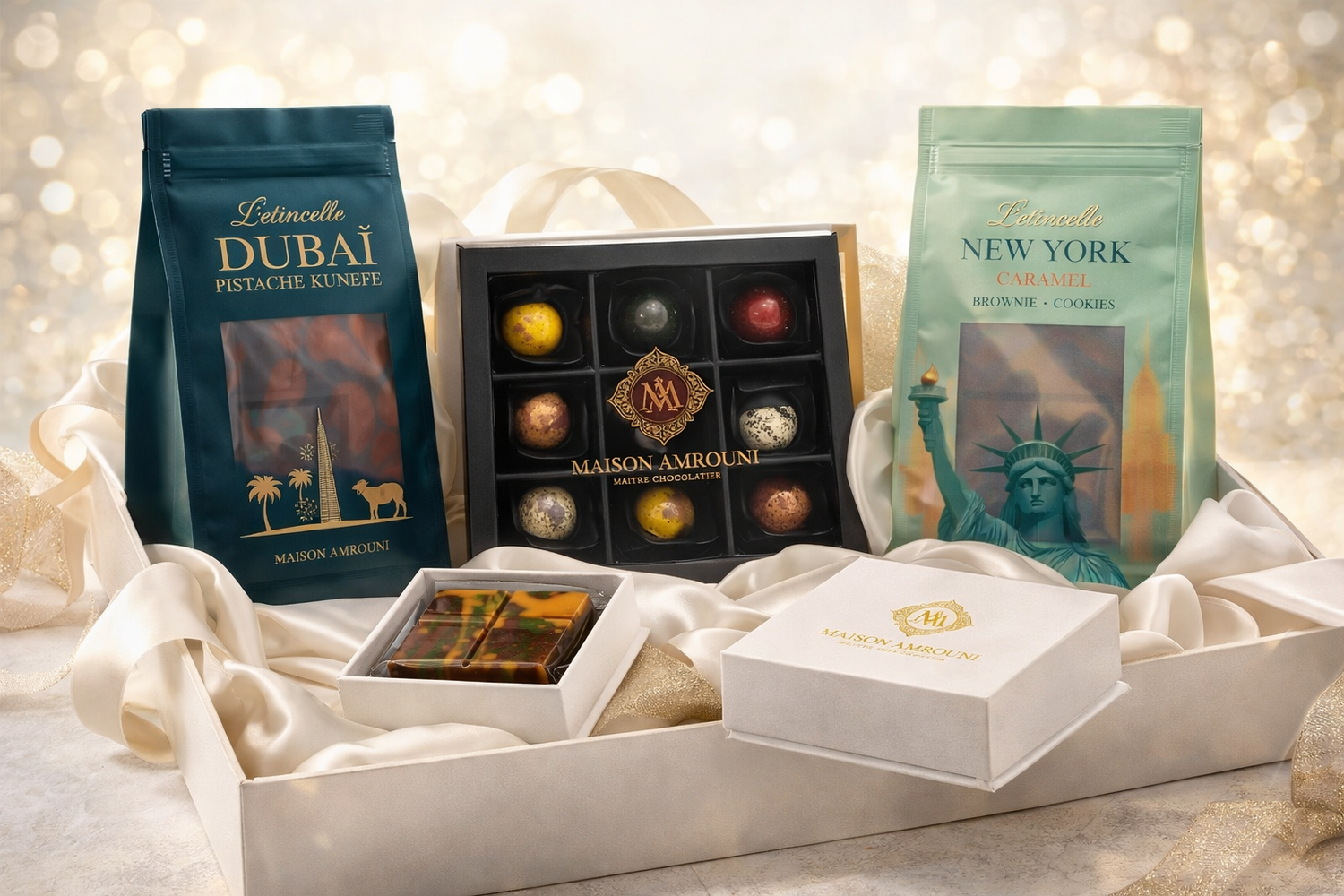 Maison Amrouni signe une collection qui fait rimer élégance et gourmandise. Chaque tablette est une escale vers de nouvelles émotions, où le chocolat révèle toute sa richesse et son caractère. Laissez-vous emporter par une expérience qui mêle art artisanal,plaisir et évasion, pour un moment suspendu qui fait voyager vos sens.